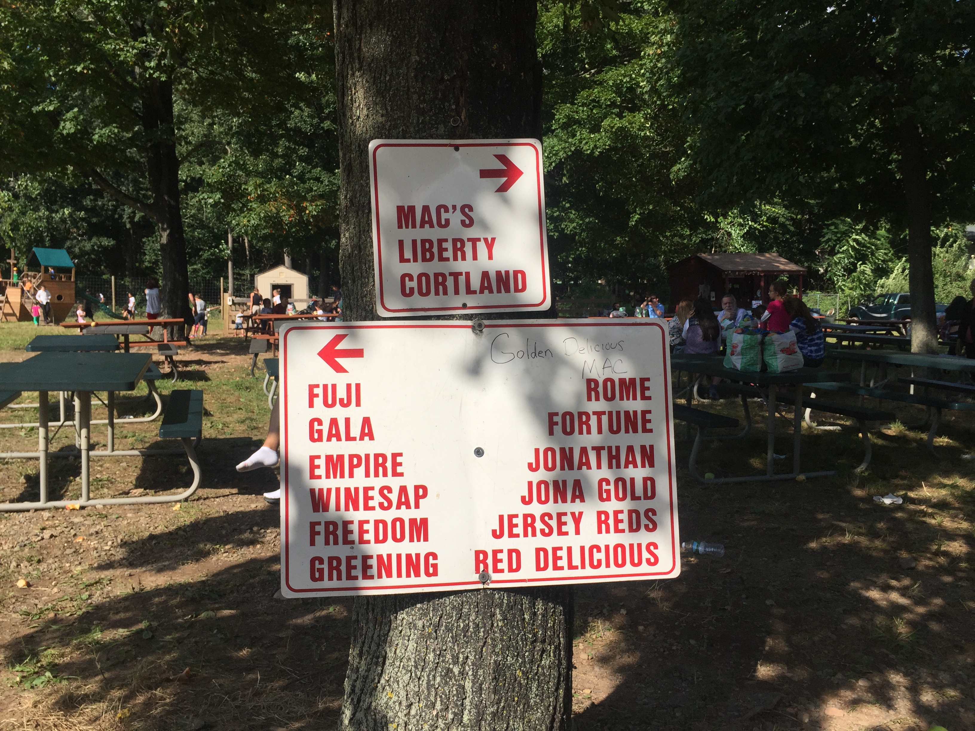 5 – Shaded seating areas for babies and picnicking: On a hot day, you can stay cool by sitting under the large trees near the apple orchard. You can pack a lunch or purchase food from the farm store. There is also a small stand with cold drinks and donuts at the top of the hill.